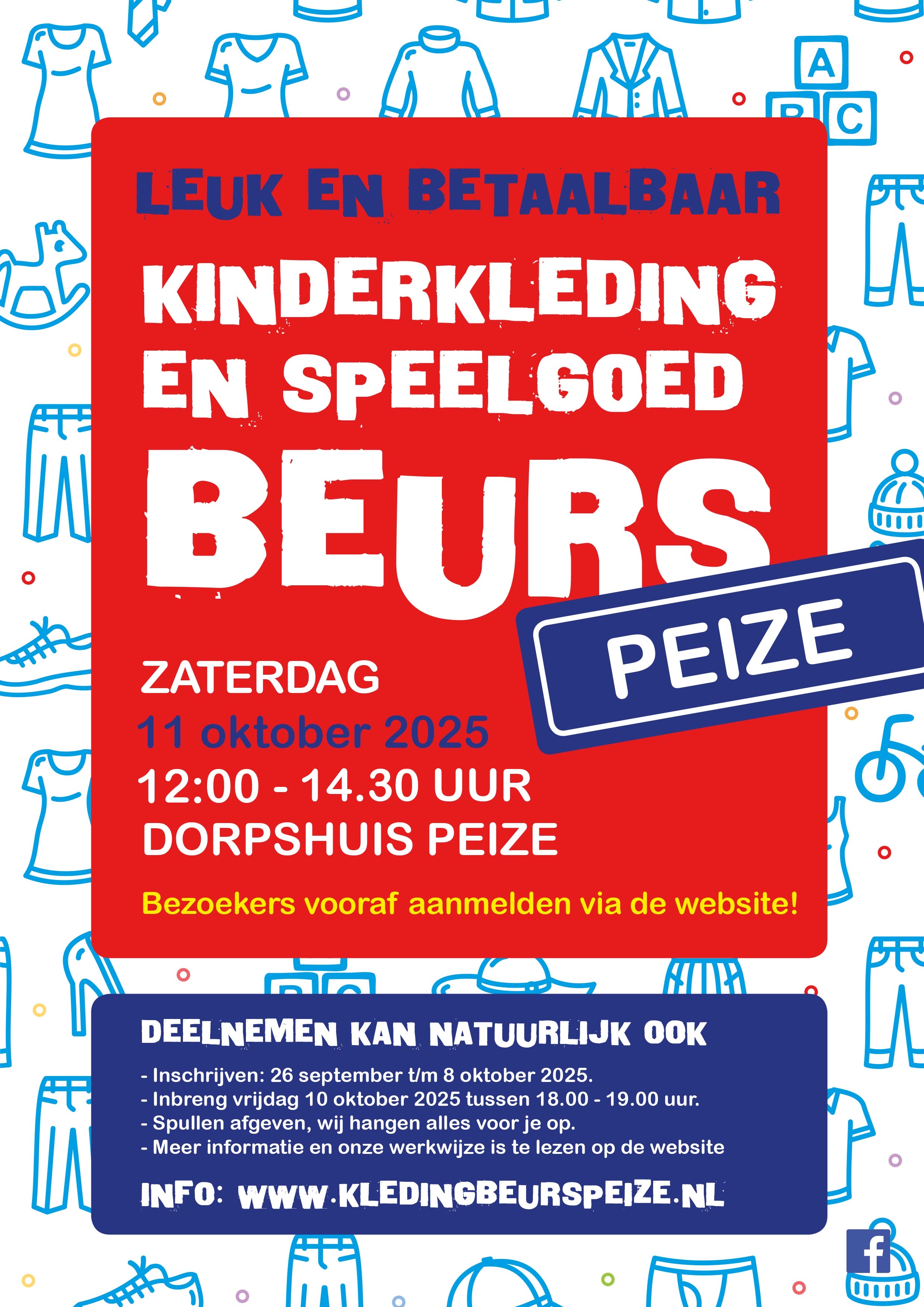Op zaterdag 11 oktober 2025 vindt de jaarlijkse Kinderkledingbeurs plaats in het Dorpshuis ‘de Essen’ in Peize. Bezoekers zijn van harte welkom tussen 12:00 – 14:30 uur om betaalbare en kwalitatief goede tweedehands kinderkleding en schoenen te kopen.