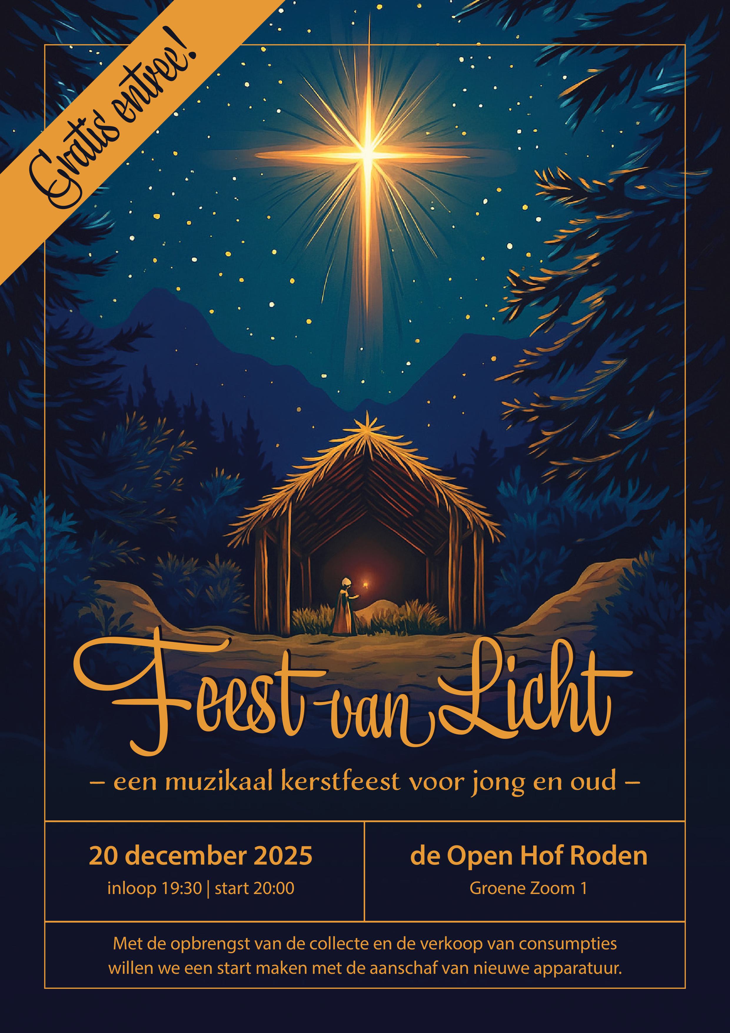 Op 20 december organiseren de 3 bands van de Open Hof een muzikale avond met het thema: Feest van Licht, met traditionele en moderne kerstliederen. De entree is gratis. De opbrengst van de consumpties en collecten zijn de start voor aanschaf voor nieuwe geluidsapparatuur. Wees van harte welkom in de Open Hof. Aanvang 20 uur.