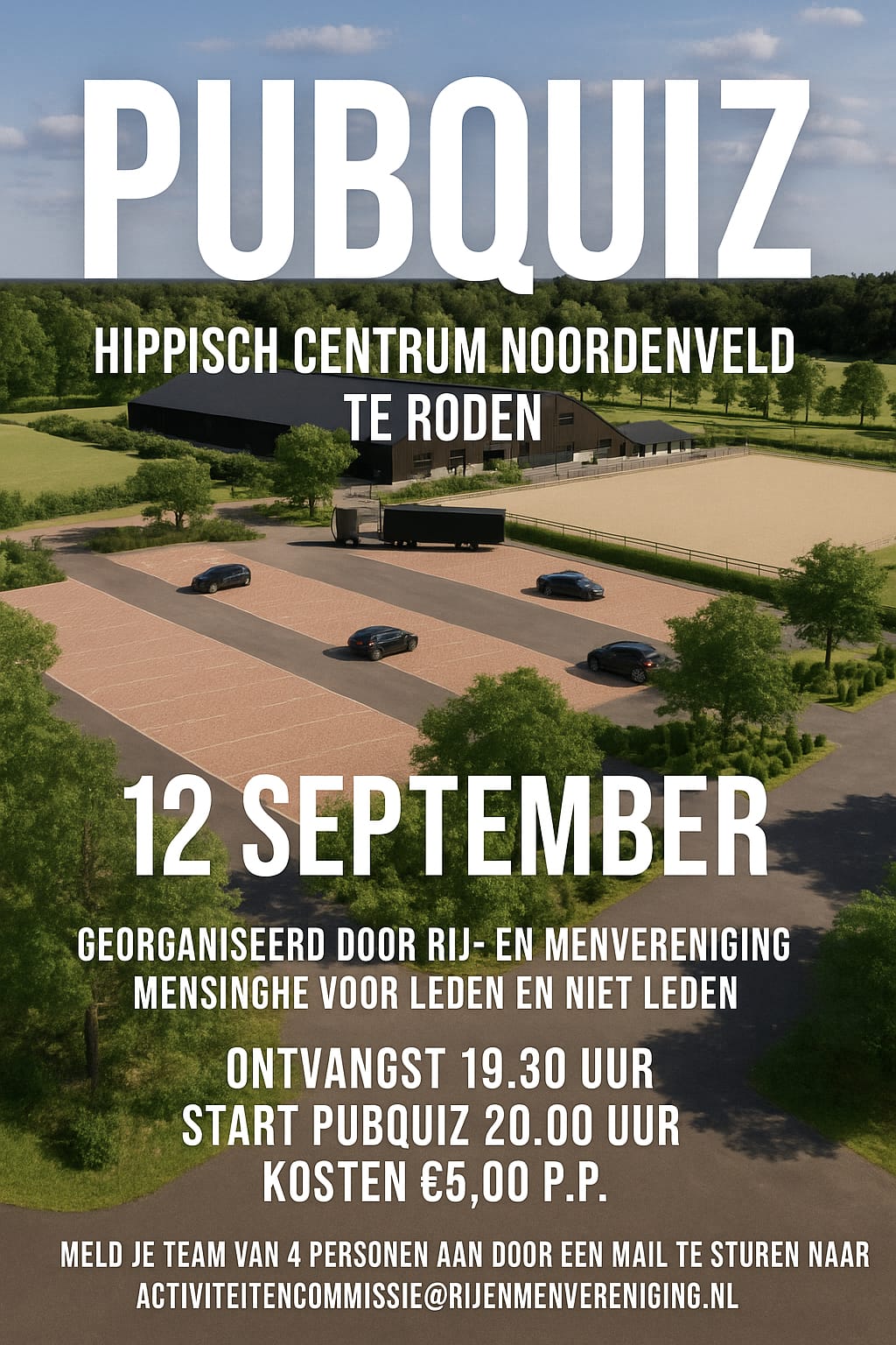 De activiteitencommissie van Rij- en Menvereniging Mensinghe organiseert op 12 september een Pubquiz op de nieuwe manege in Roden, het Hippisch Centrum Noordenveld aan de Esweg. De pubquiz wordt georganiseerd voor leden en niet leden.