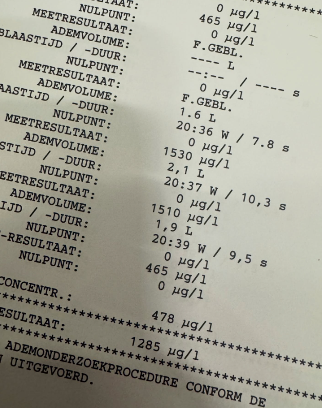 Bij een blaastest op straat scoorde de man een F, waarna hij is meegenomen naar het politiebureau in Leek. Daar wees een ademanalyse uit dat hij 1285 microgram alcohol per liter uitgeademde lucht had genuttigd. Dat is bijna zes keer de wettelijk toegestane hoeveelheid.