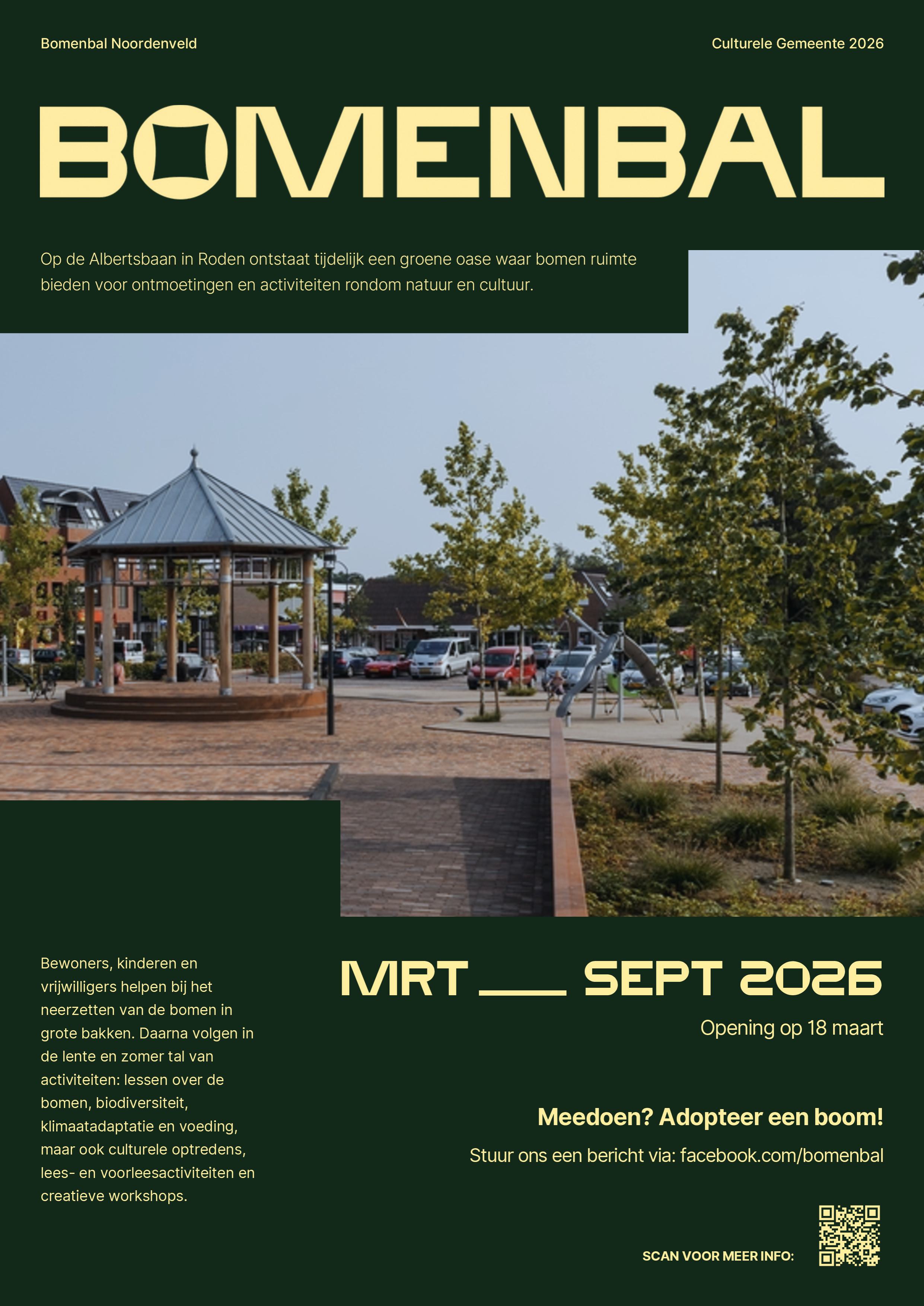 De feestelijke opening van het Bomenbal vindt plaats op 18 maart 2026. Met dit evenement draagt Roden zichtbaar bij aan de culturele en groene ambities van Noordenveld en wordt een breed publiek uitgenodigd om stil te staan bij de betekenis van bomen, nu en in de toekomst.