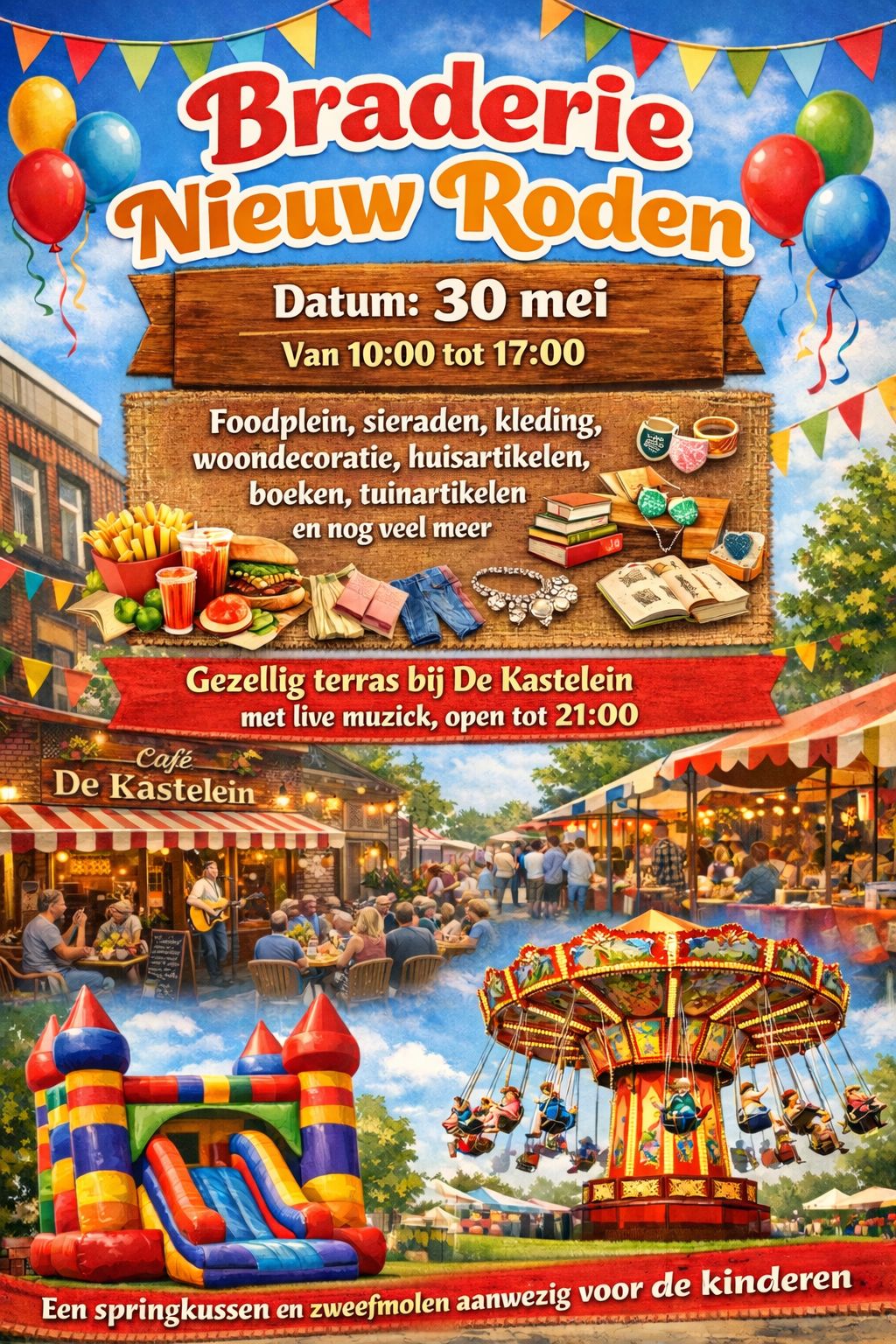 Op zaterdag 30 mei verandert de Dorpsstraat in het hart van het dorp in een levendige braderie vol kraampjes, muziek en gezelligheid. Tussen 10.00 en 17.00 uur kunnen bezoekers langs zo’n zestig kramen struinen, aangevuld met meer dan vijftien eigen stands met eten en drinken. Ook wordt er een gezellig foodplein ingericht.