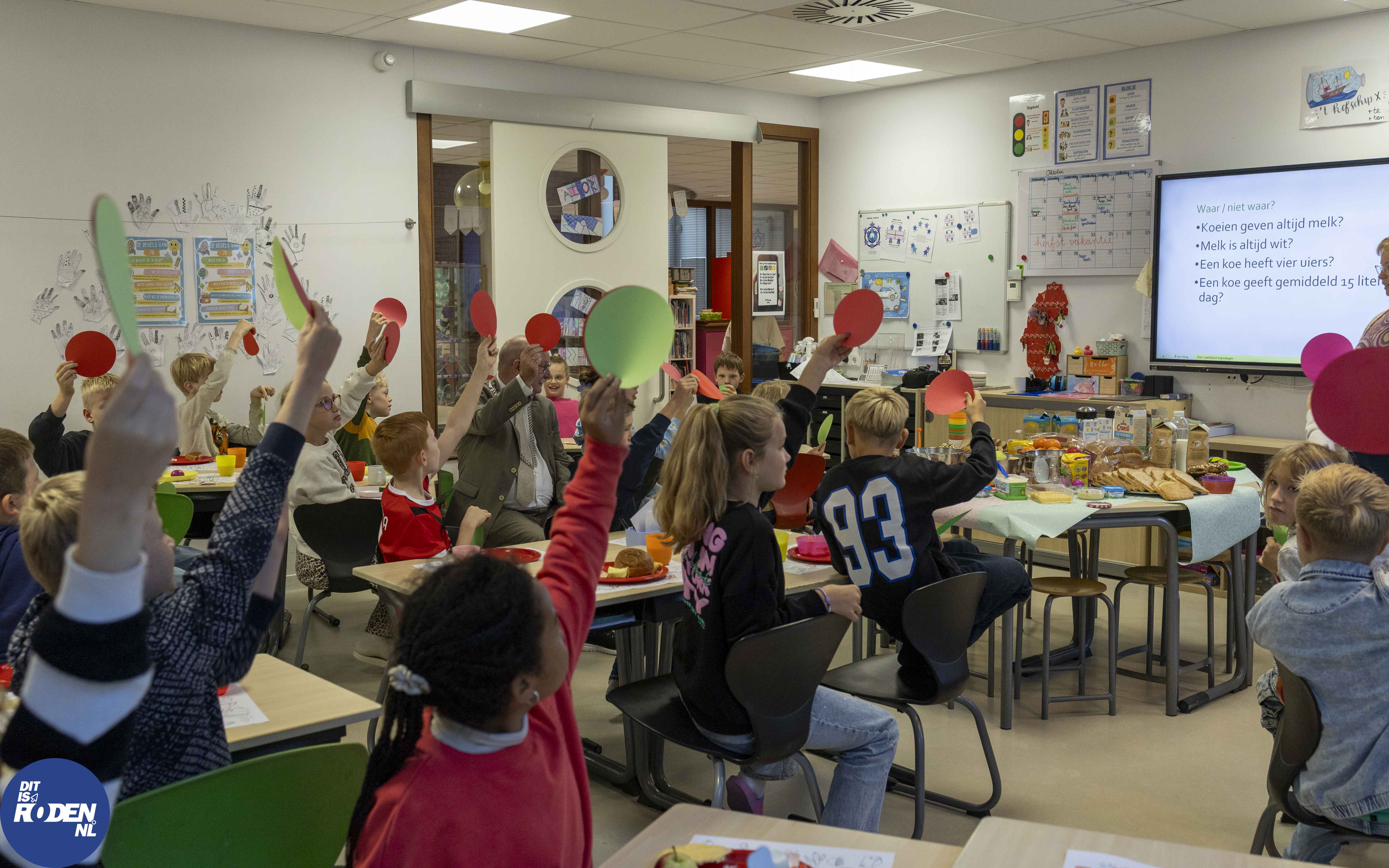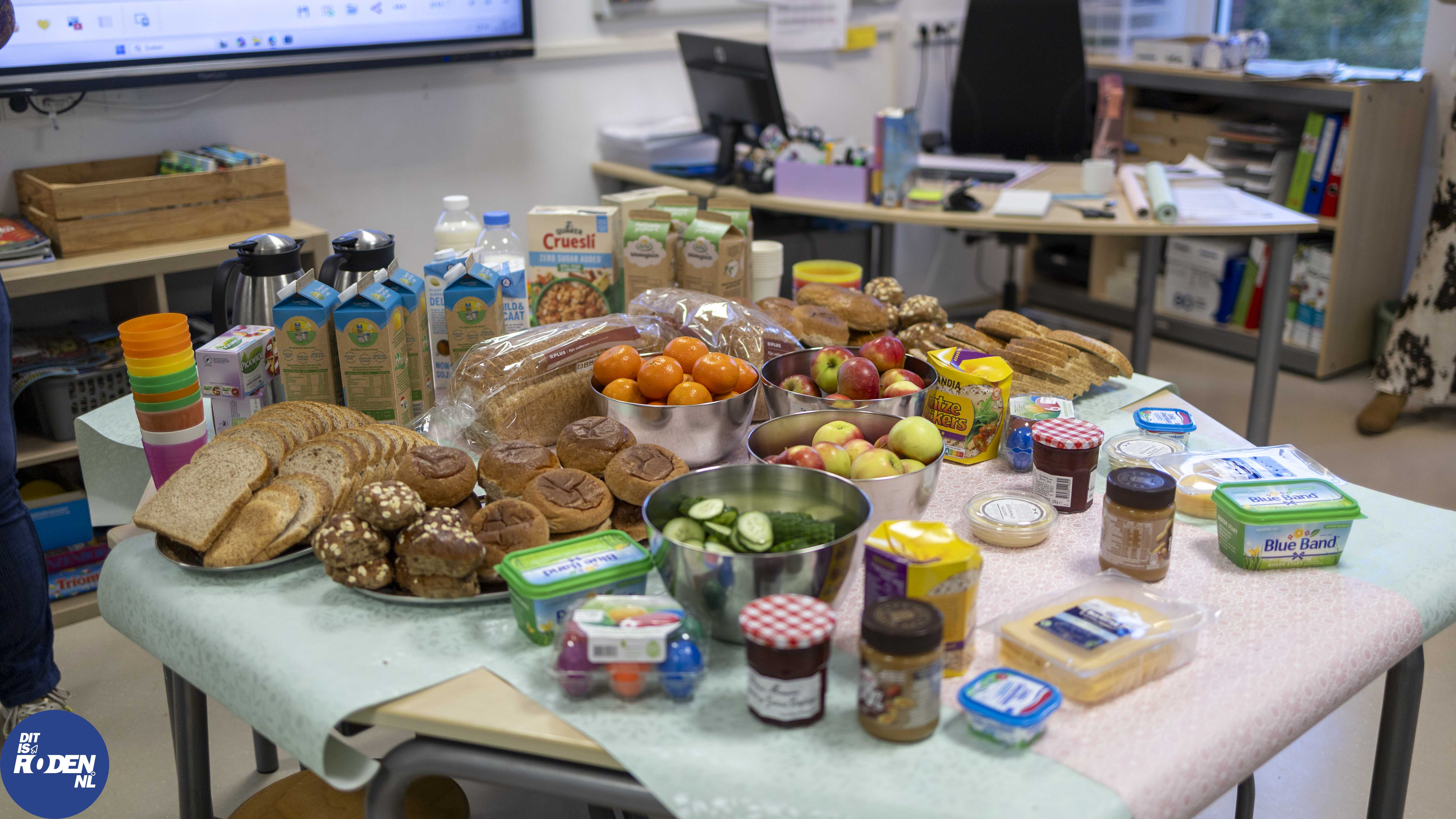 Het jaarlijkse Burgemeestersontbijt werd dit jaar gehouden op de Poolster in Nieuw-Roden. Om half negen stond er een rijkgevulde ontbijttafel klaar voor de kinderen van groep 7B. Samen met burgemeester Klaas Smid genoten de kinderen van een lekker en gezond ontbijt. Iedereen mocht pakken wat hij of zij lekker vond. Er was keuze uit verschillende volkorenbroodjes, beleg, yoghurt en fruit. Voor het drinken was er (soja)melk en thee.