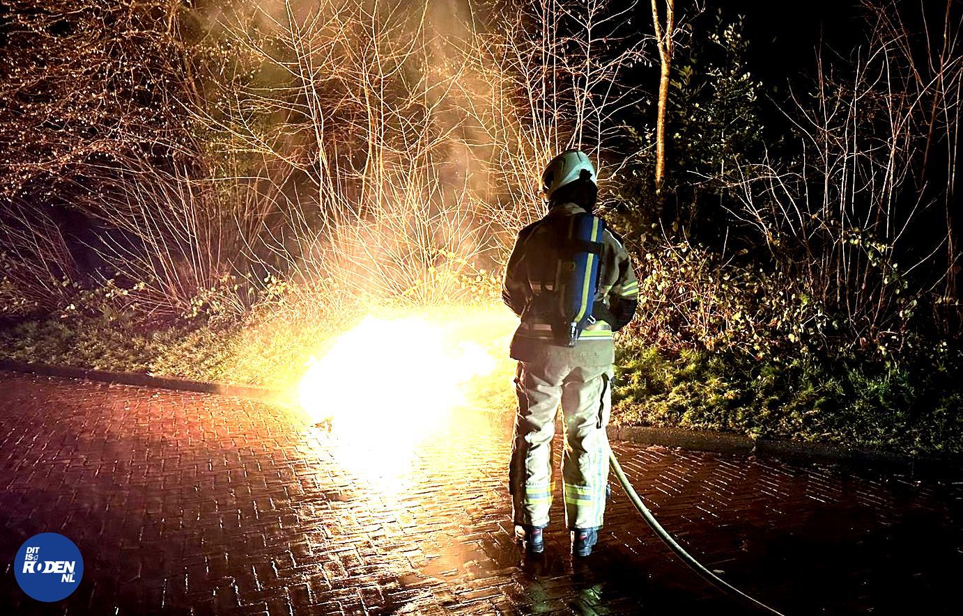 De brandweer had het vuur snel onder controle, maar de schade was aanzienlijk. Van de container is weinig meer over dan vervormd plastic en verbrande resten papier in de berm. Het lijkt er sterk op dat de brand is aangestoken.