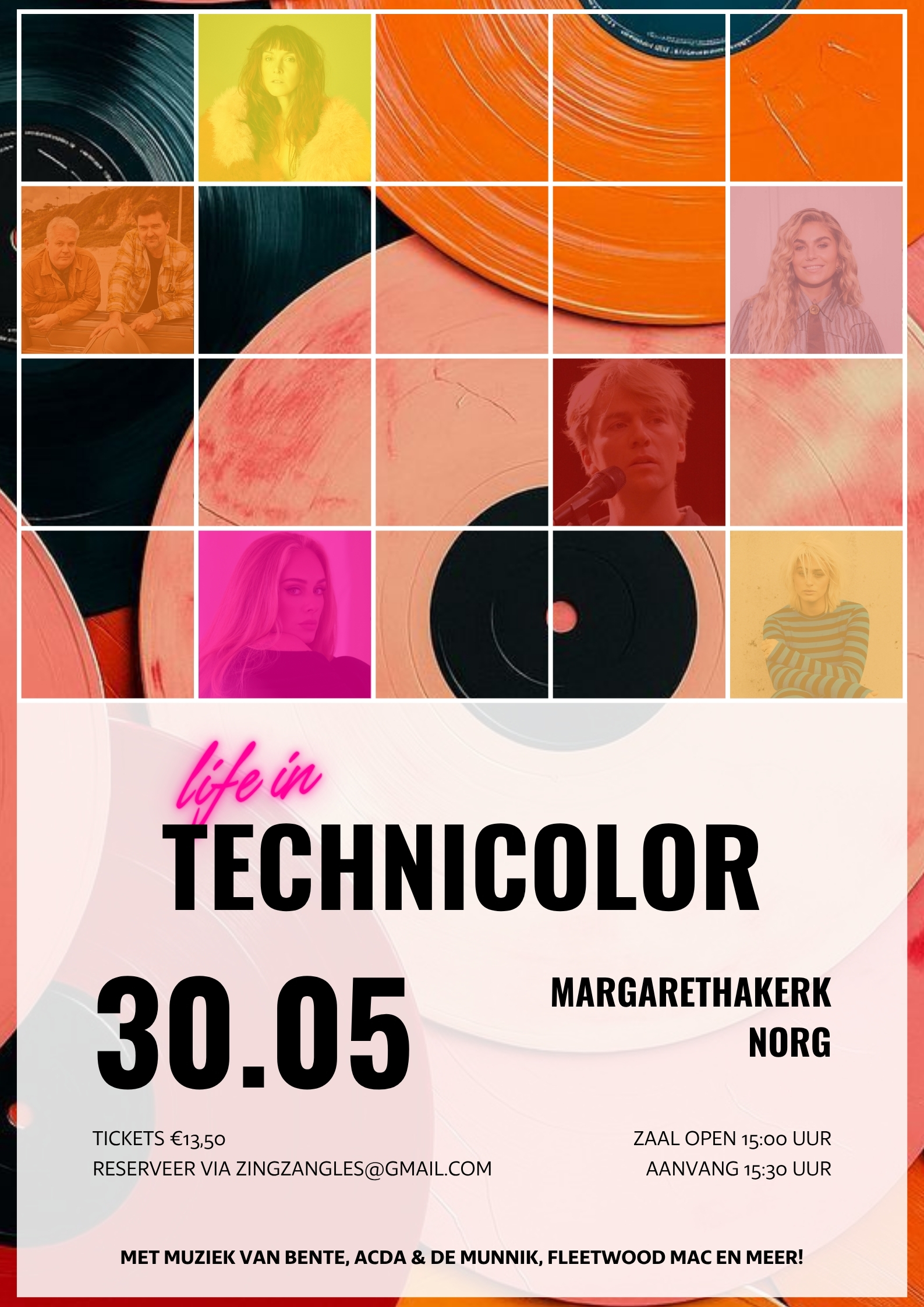 Het concert vindt plaats op zaterdag 30 mei in de Margarethakerk in Norg. Tickets kosten €13,50 en zijn te reserveren via zingzangles@gmail.com. Vanwege de beperkte capaciteit wordt aangeraden om tijdig kaarten te reserveren.