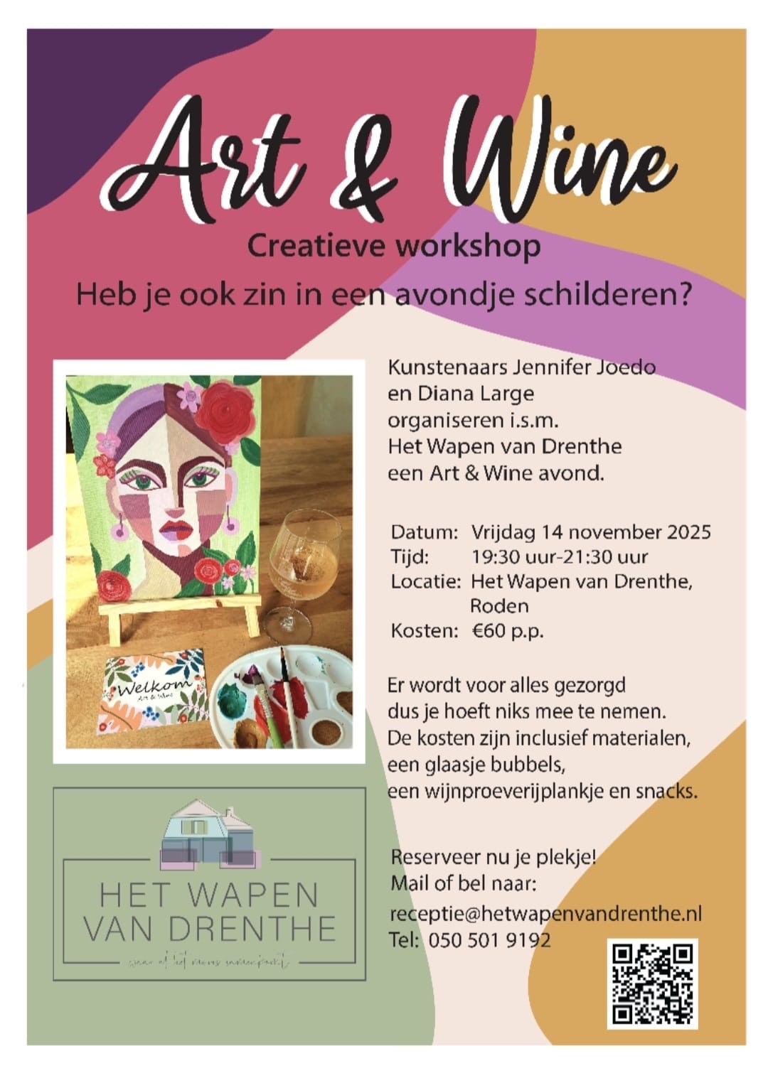 Vrijdag 14 november organiseren kunstenaars Diana Large en Jennifer Joedo in samenwerking met Wapen van Drenthe weer een Art & Wine avond. Deze avond gaan we abstracte portretten schilderen. Bij binnenkomst wacht er een glaasje bubbels en tijdens de workshop proef je drie wijnen met bijpassende hapjes. Aan het eind van de avond neem je je eigen kunstwerk mee naar huis. Er zijn nog enkele plekken beschikbaar.