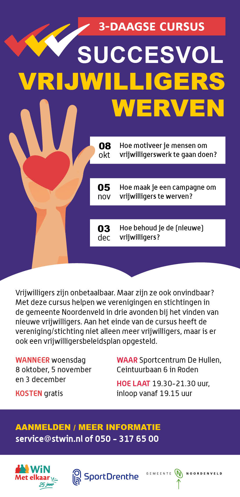 Vrijwilligers zijn onbetaalbaar. Maar zijn ze ook onvindbaar? Met deze cursus helpen we verenigingen en stichtingen in de gemeente Noordenveld in drie avonden bij het vinden van nieuwe vrijwilligers.