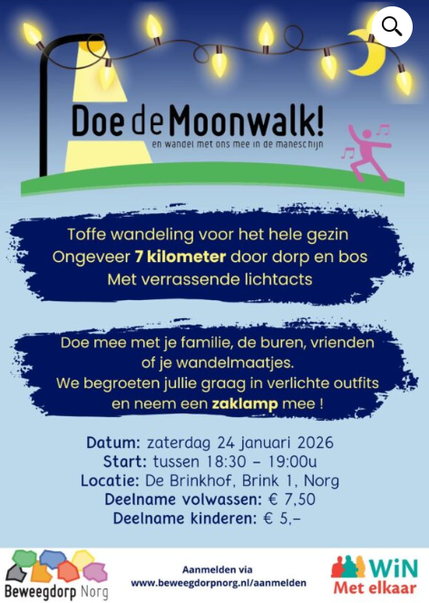 Na de geslaagde eerste editie vorig jaar keert de MoonWalk! in januari terug naar Norg. Welzijn in Noordenveld en Beweegdorp Norg slaan opnieuw de handen ineen en organiseren op zaterdag 24 januari 2026 een avondwandeling van circa zeven kilometer, geschikt voor jong en oud.