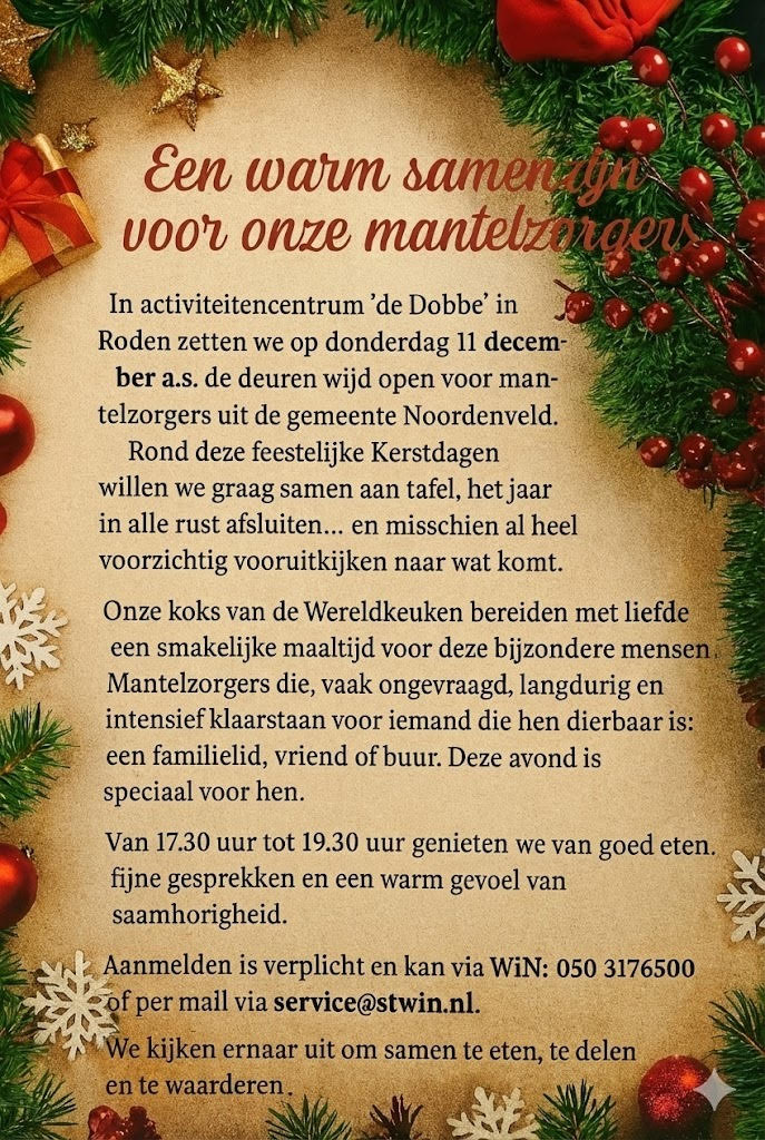 In activiteitencentrum ‘de Dobbe’ in Roden zetten we op donderdag 11 december a.s. de deuren wijd open voor mantelzorgers uit de gemeente Noordenveld. Rond deze feestelijke Kerstdagen willen we graag samen aan tafel, het jaar in alle rust afsluiten… en misschien al heel voorzichtig vooruitkijken naar wat komt.