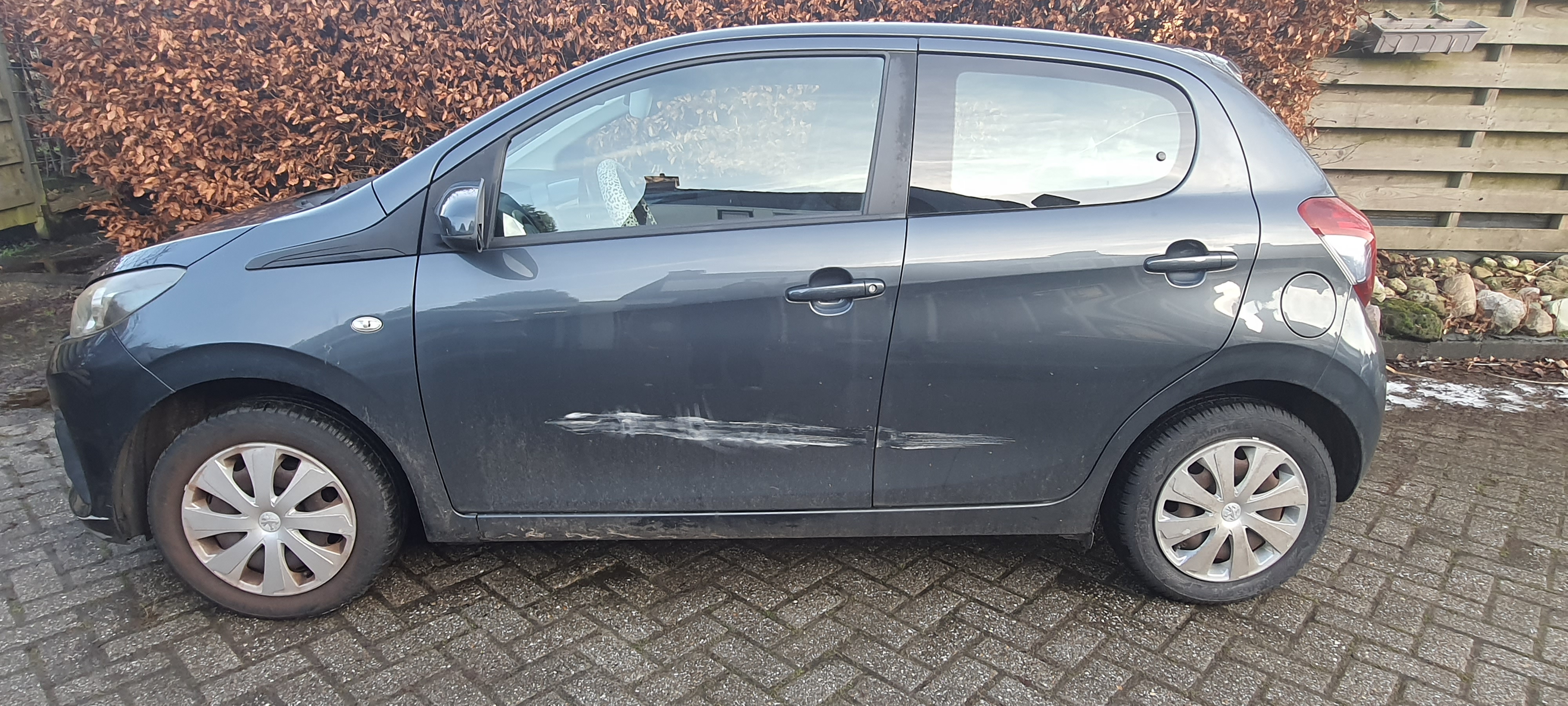 De auto, een donkergrijze Peugeot 108, stond geparkeerd in de vakken voor de winkel, op korte afstand van de container van het Leger des Heils. De veroorzaker heeft geen briefje achtergelaten.