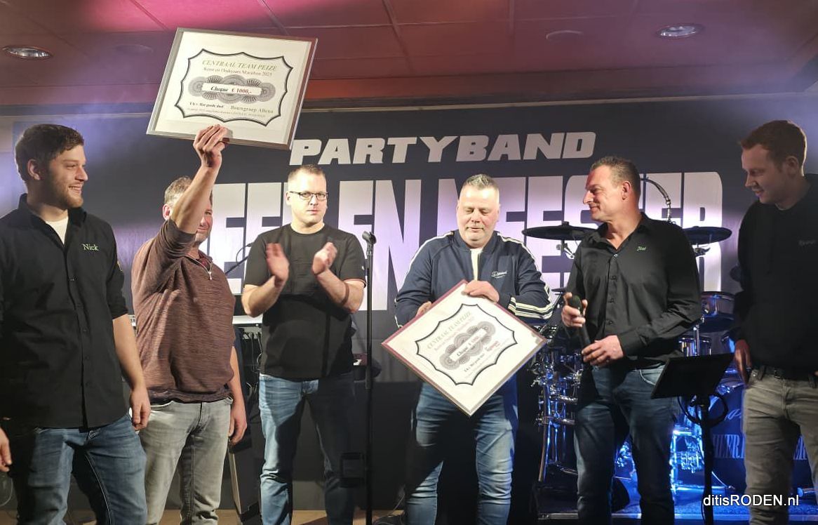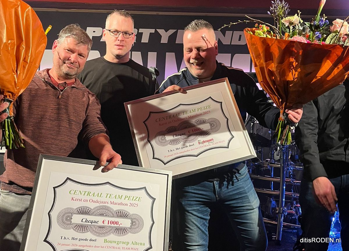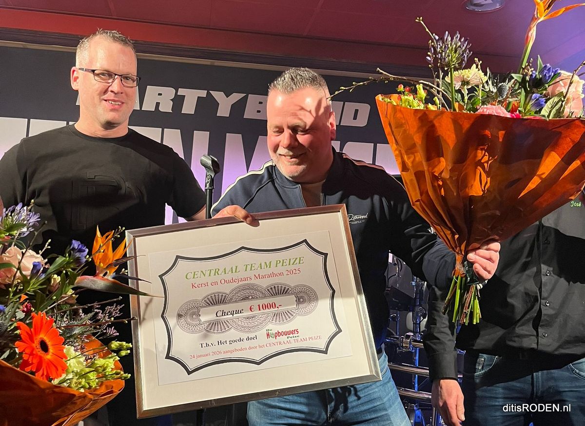 De opbrengst van een week lang uitzenden tussen kerst en oudjaarsdag, vanuit de keet met live muziek en leuke activiteiten, levert ook een winst op. Deze winst gaat zoals ieder jaar naar een goed doel, dit jaar zelfs 2 goede doelen! Namelijk aan de Rodermarktparade wagenbouwers De Hopbouwers en Bouwgroep Altena. Zaterdagavond werd een cheque van maar liefst 1.000 euro overhandigd aan deze bouwgroepen.Â