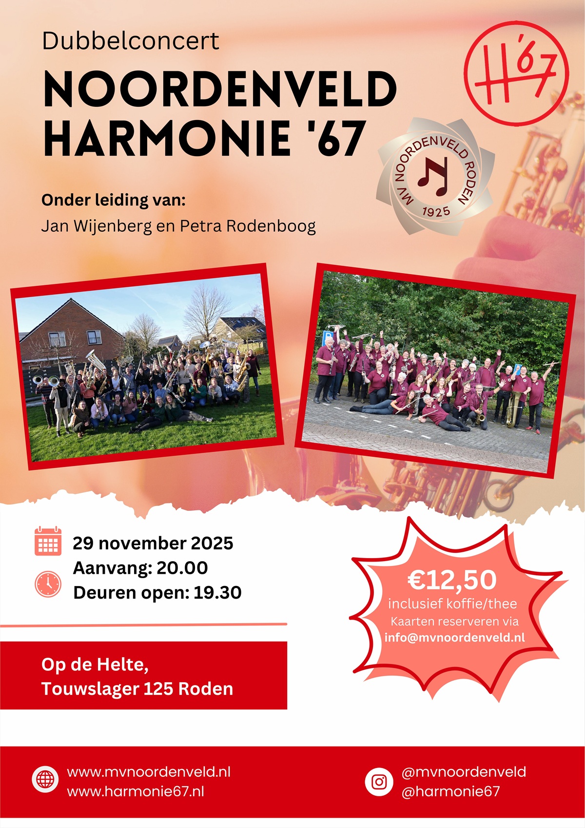 Op zaterdag 29 november geven Harmonieorkest Noordenveld en Harmonie’67 een dubbelconcert. Beide verenigingen hebben de handen ineen geslagen om een prachtige muzikale avond neer te zetten.