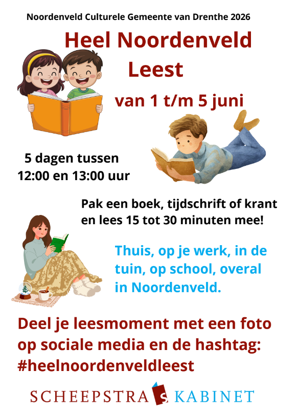 RODEN – In het kader van “Noordenveld Culturele Gemeente van Drenthe 2026” wordt begin juni een bijzondere leesactie georganiseerd. Het Scheepstra Kabinet roept inwoners op om massaal mee te doen aan “Heel Noordenveld Leest”.