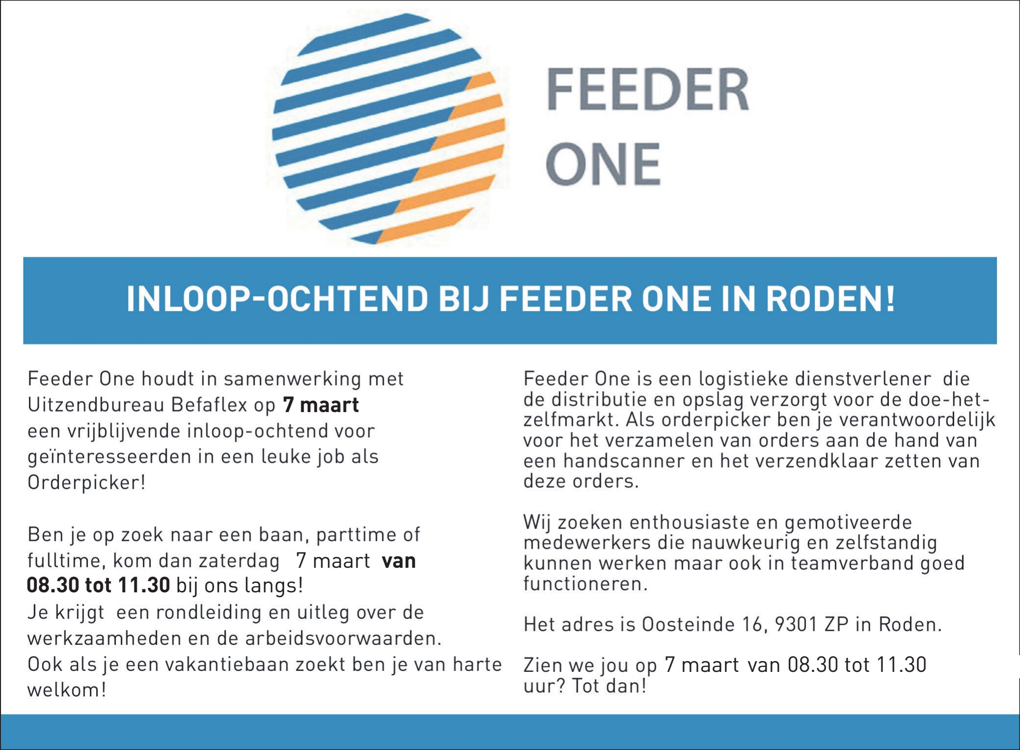 Deze inloopochtend is afgelopen jaren vaker gehouden en was altijd een succes. Nu Feeder One weer op zoek is naar een aantal geschikte medewerkers wordt deze inloop-ochtend weer georganiseerd, dit in samenwerking met vaste partner Befaflex Uitzendbureau B.V. uit Roden. Het is een low-profile kennismaking met het bedrijf en de werkplek, en uit voorgaande edities van de inloop-ochtend is gebleken dat dit goed werkt!