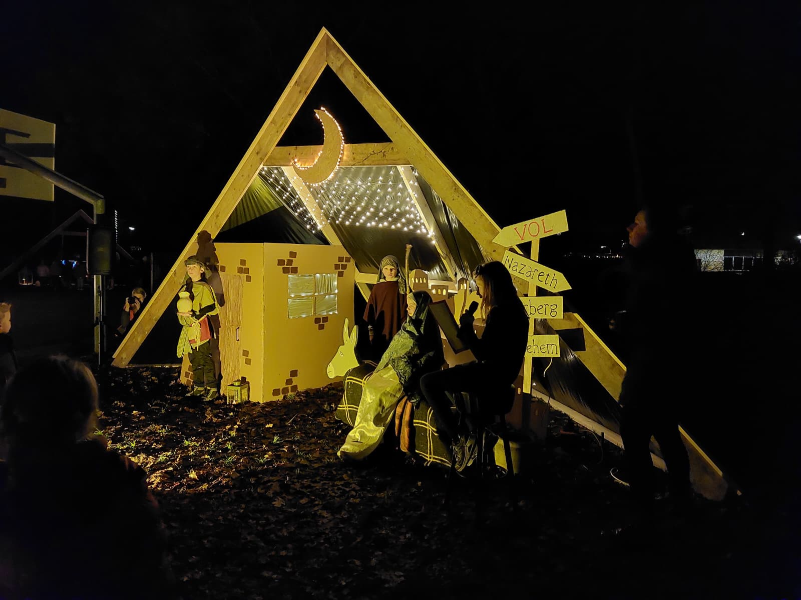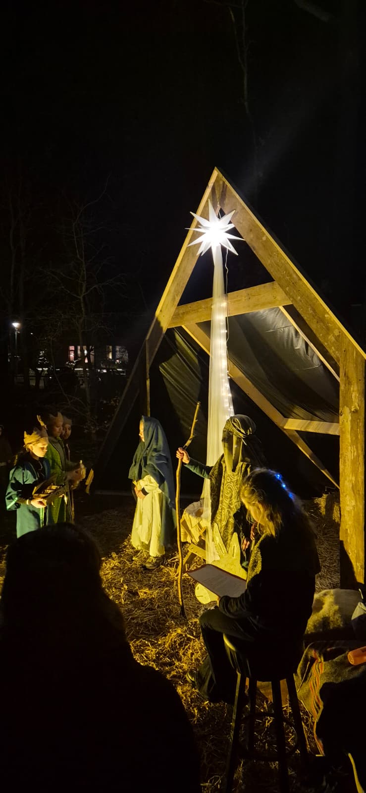 Vervolgens werd er door vertellers en figuranten uit de bovenbouw het Kerstverhaal verteld in vier levende schilderijen. Alle leerlingen maakten een wandeling langs deze vier taferelen en zagen het Kerstverhaal uitgebeeld worden in prachtige decors, verlichte details en figuranten in de mooiste kostuums.