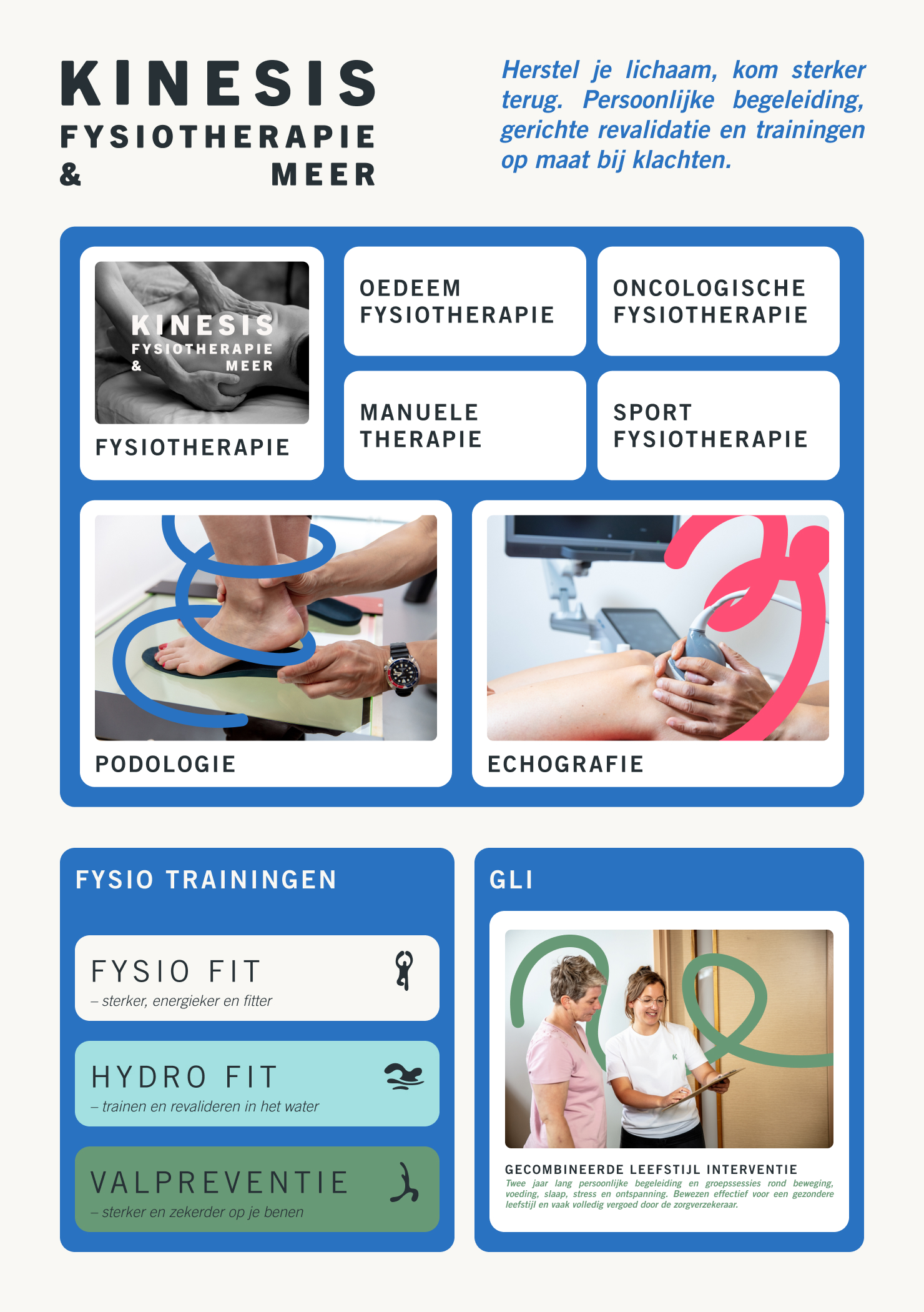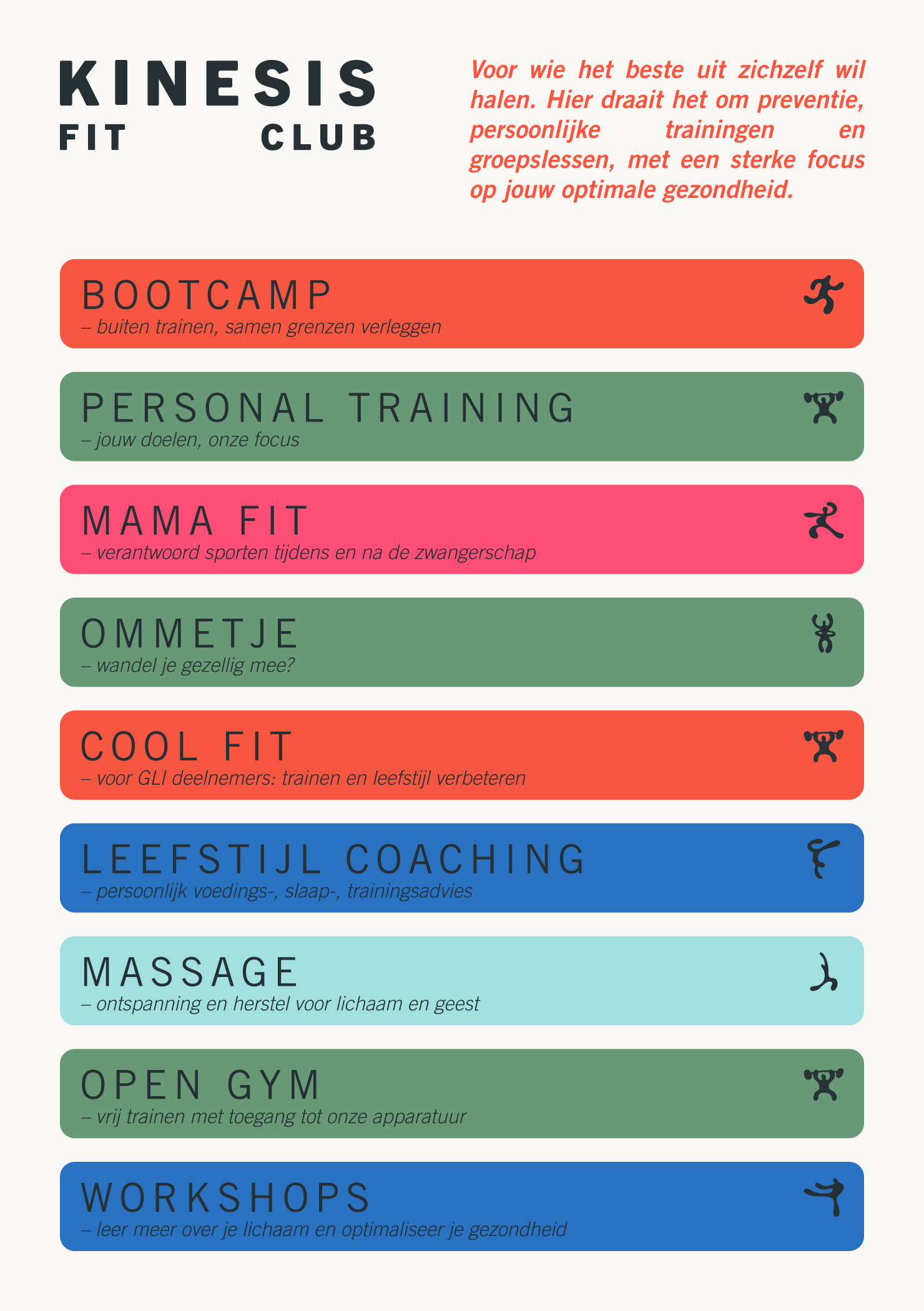 De Kinesis Fit Club is er voor iedereen die gezond wil blijven of klachten wil voorkomen. De website wordt binnenkort vernieuwd, maar via de socials is het aanbod nu al te bekijken.