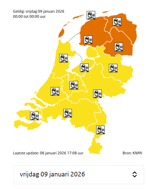 Verder is het in het hele land plaatselijk glad, vooral op binnenwegen. In de loop van vrijdagmiddag en -avond kan het in de rest van het land gaan sneeuwen. Hiervoor blijft code geel van kracht. Wegen, fietspaden en stoepen zijn glad. Het wegverkeer, maar ook fietsers en voetgangers kunnen hinder ondervinden.