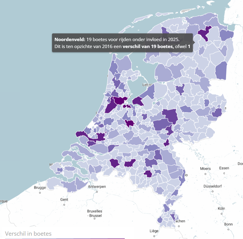 Afgelopen jaar werden er om precies te zijn 215 bekeuringen uitgeschreven voor rijden onder invloed in Emmen. Hoogeveen volgt met 165 bekeuringen. Assen maakt de top drie compleet met 118 boetes voor rijden onder invloed. Noordenveld 19 boetes voor rijden onder invloed in 2025. In 2024 waren het er nog 28 boetes, een verschil van 9.