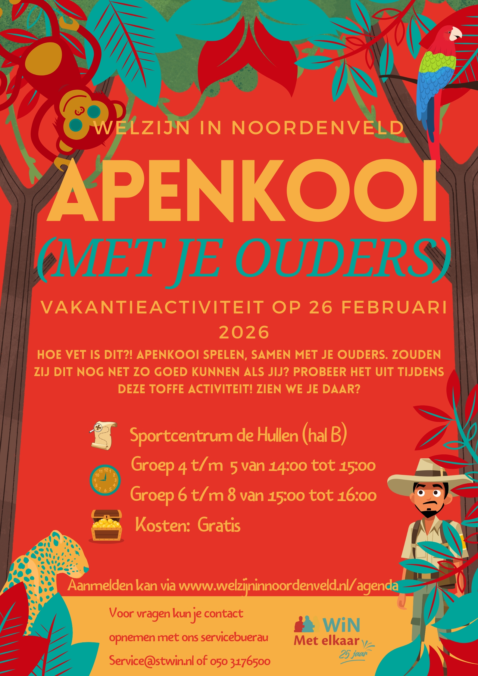 Op 26 februari wordt Sporthal De Hullen omgetoverd tot een uitdagend apenkooi-parcours. Klim, klauter, ren en werk samen om uit handen te blijven van de jager. Plezier, beweging en een beetje gezonde competitie gegarandeerd. En eerlijk: hoe leuk is het om dit samen met je kind te doen in plaats van alleen toe te kijken?