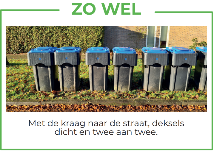 - De container staat met de kraag naar de straat. De wielen van de container staan dus richting de berm of stoep;