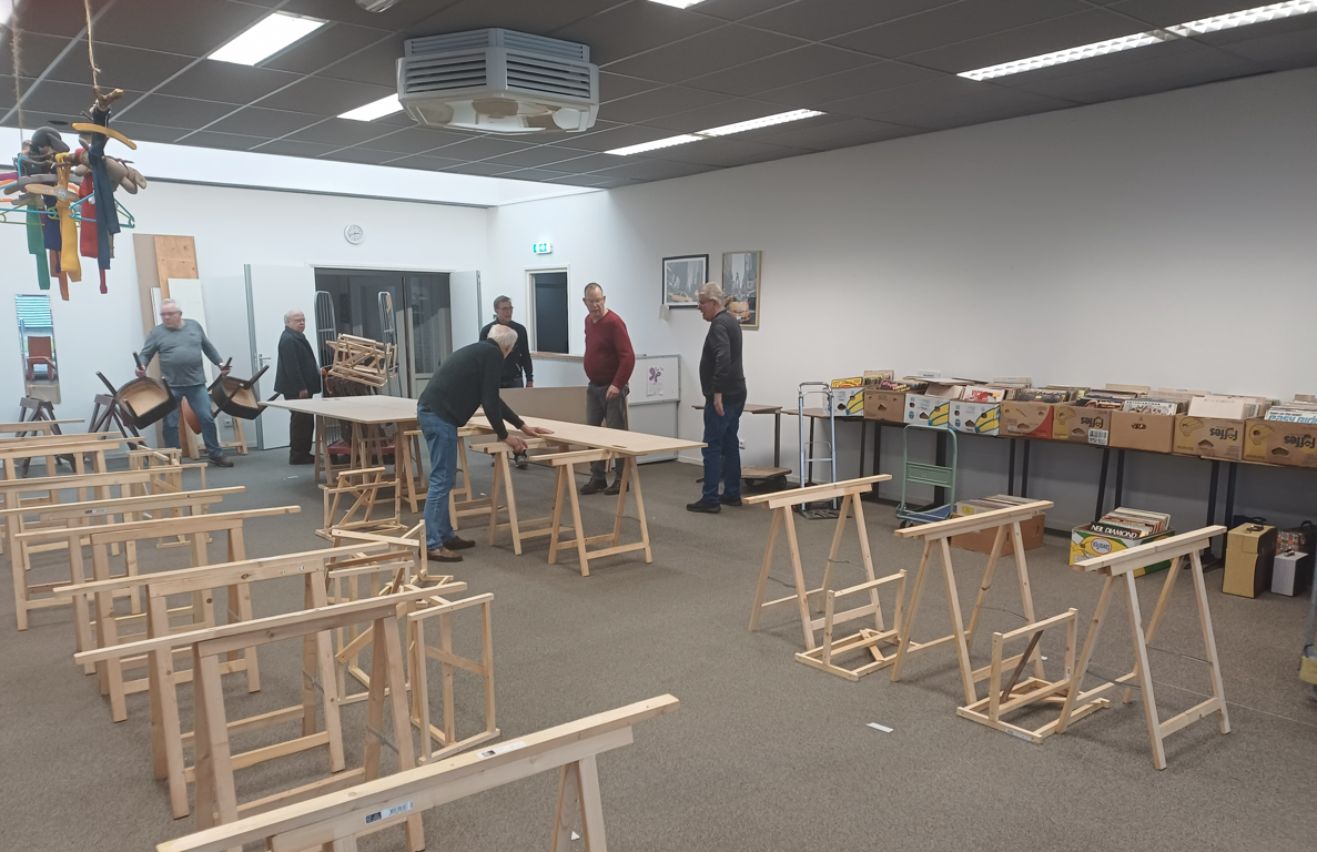 Op vrijdag ging de bouwploeg van de Roder Boekenmarkt weer enthousiast aan de slag. De voormalige kledingbank werd volledig ontruimd, waarna meteen werd begonnen met het opbouwen van de stevige boekenstands. Geen overbodige luxe, want die moeten straks vele kilo’s aan boeken kunnen dragen, meer dan 50.000 exemplaren wachten namelijk op een nieuwe eigenaar.