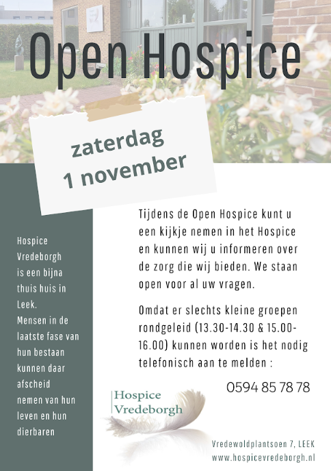 Hospice Vredeborg organiseert vier keer per kaar een Open Hospice. Belangstellenden kunnen dan een kijkje nemen in Hospice Vredeborgh.