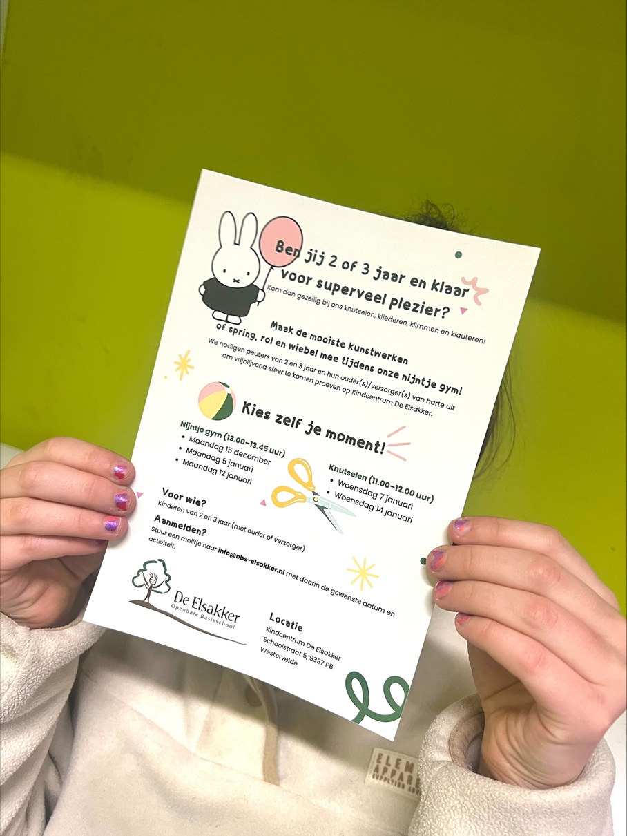WESTERVELDE - In de maanden december en januari heet Kindcentrum De Elsakker alle kinderen van twee en drie jaar oud van harte welkom tijdens speciale kennismakingsmomenten! Ouders kunnen hun kind voor een of meerdere momenten aanmelden voor gezellige activiteiten zoals nijntje gymnastiek en knutselen. Zo kunnen peuters alvast kennismaken met de sfeer op onze school.