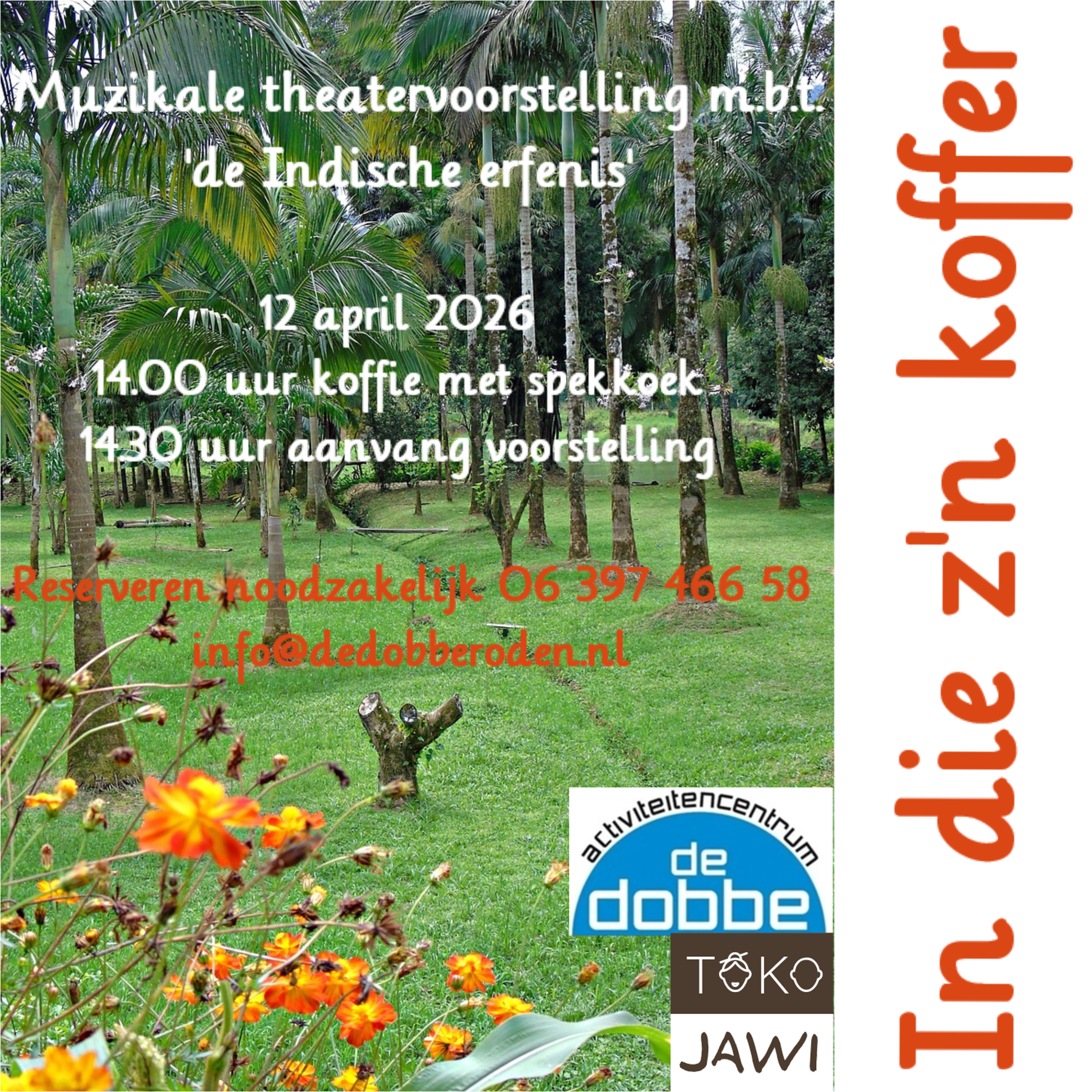Na een overweldigende belangstelling en een lange reservelijst mogen we het eindelijk opnieuw zeggen: u bent van harte welkom bij de extra muzikale theatervoorstelling ‘In die z’n koffer’. Op 12 april keert de theatergroep terug om dit bijzondere, waargebeurde verhaal nog één keer met ons te delen. Onze ouders zijn er inmiddels niet meer, hun stemmen zijn verstild, maar hun verhalen klinken door in hun kinderen, klein- en achterkleinkinderen en theatergroep ‘TJAMPOER’.