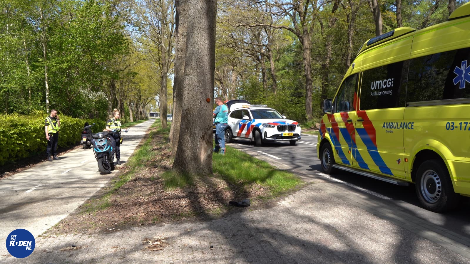 HUIS TER HEIDE – Donderdag rond het middaguur zijn twee scooters met elkaar in botsing gekomen op het fietspad langs de Asserstraat. Door de klap kwamen beide bestuurders ten val, waarbij één van de scooters uiteindelijk tegen een boom tot stilstand kwam.