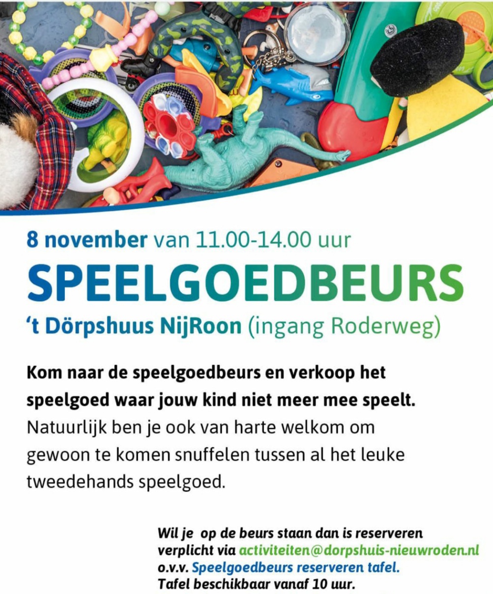 In Nieuw-Roden wordt op zaterdag 8 november een gezellige speelgoedbeurs gehouden in ’t Dörpshuus (ingang aan de Roderweg). Bezoekers zijn tussen 11.00 en 14.00 uur welkom om lekker te snuffelen tussen het tweedehands speelgoed – van puzzels tot poppen en van auto’s tot spelletjes. Er is voor ieder wat wils.