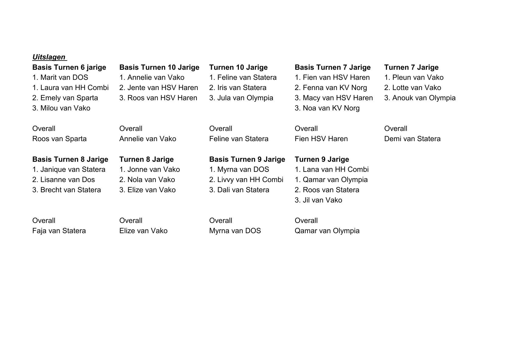 Het was prachtig om te zien hoe al die weken van hard oefenen vandaag samenkwamen op de vloer. De jonge turners en turnsters stonden te stralen en lieten hun mooiste kunsten zien: van strakke koprollen en radslagen tot de uitdagende arabier, flikflak, handstand en overslag. Het publiek op de tribune, bestaande uit uitzinnige ouders, grootouders en familieleden, liet zich horen met luid applaus en aanmoedigingen.