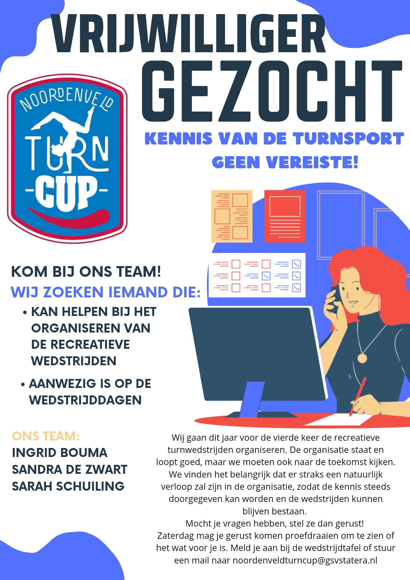 • Om dit evenement ook in de toekomst te kunnen waarborgen, zoeken we enthousiaste versterking! Lijkt het jou leuk om samen met ons drie wedstrijden per jaar te organiseren? Er is immers niets mooiers dan al die kinderen te zien schitteren in hun sport. Heb je interesse? Neem dan contact met ons op via ledenadministratie@gsvstatera.nl