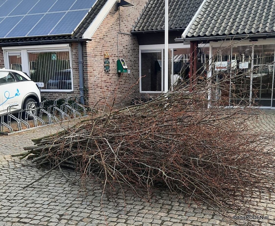 Een bewoner van de Brink in Roden keek vrijdag aan het einde van de middag even vreemd op. Overdag waren er takken uit bomen gehaald, vermoedelijk in opdracht van de gemeente. Alleen bleven de afgezaagde takken na het werk gewoon liggen, midden op de stoep.