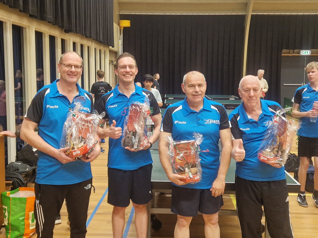Het is niet veel seniorenteams gegeven om vanaf de opstart twee keer achtereen te promoveren, maar het is het ervaren team 2 van ttv Talero gelukt. Met nog één wedstrijd te gaan waren Marcel Rikhof, Nico Veen, Gerwin Fokkema en Victor van der Ploeg niet meer te achterhalen. Voorzitter Lex Bruijn overhandigde een cadeau voor ieder en vervolgens werd Midstars 5 ook nog eens met 7-3 verslagen. Marcel bleef ongeslagen!