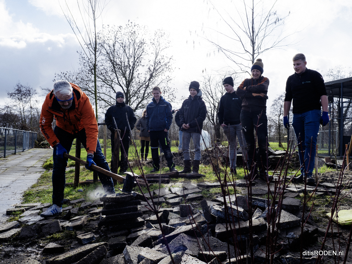 De wethouder kwam niet alleen kijken, maar stak daadwerkelijk de handen uit de mouwen. Stenen werden kapotgeslagen, verplaatst en opnieuw gelegd. Even later nam hij zelfs plaats op de trekker om nieuw materiaal aan te voeren. Tussen het werk door sprak hij met de leerlingen over hun rol in het project en waarom biodiversiteit juist op schoolterreinen zo belangrijk is.
