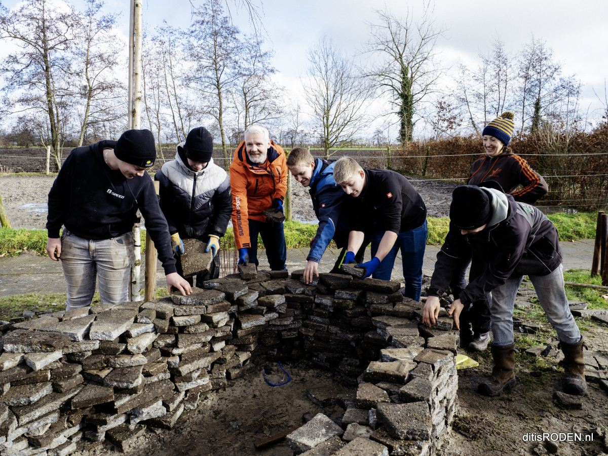 Foto 3 Leerlingen werken aan het leggen van de stenen, met hulp van wethouder Bé Schollema.
