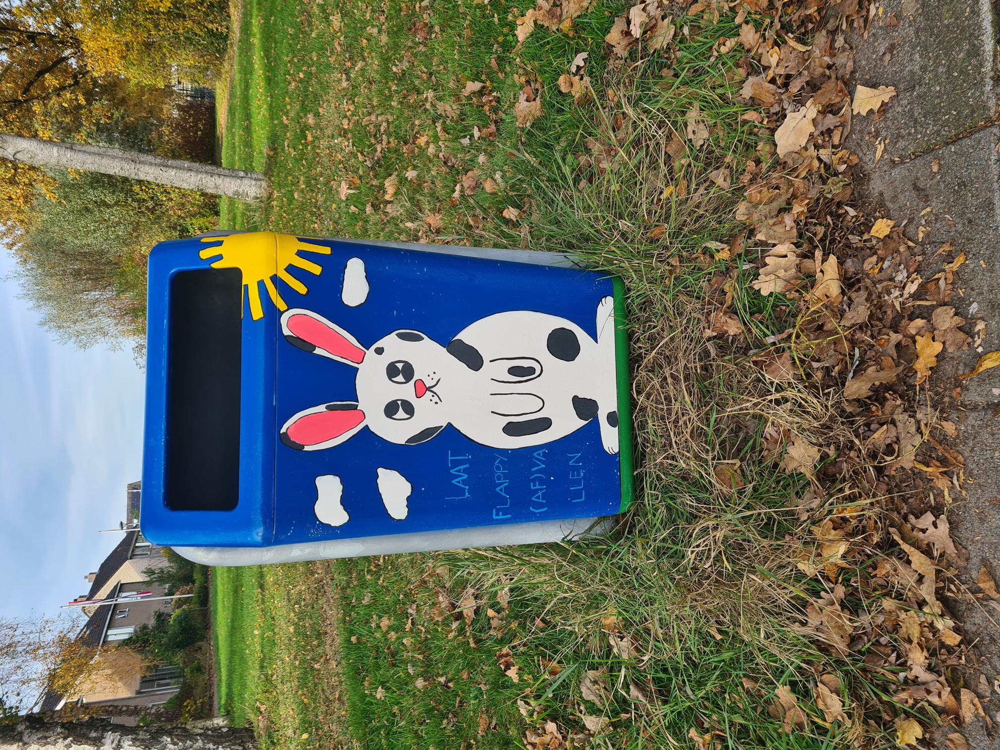 Door prullenbakken te beschilderen hopen de kinderen dat er meer afval in de bakken gegooid wordt dan ernaast. Nadat de eerste bak in Roderwolde is geplaatst is nu bij cbs De Hoeksteen in Roden een tweede beschilderde prullenbak geplaatst.