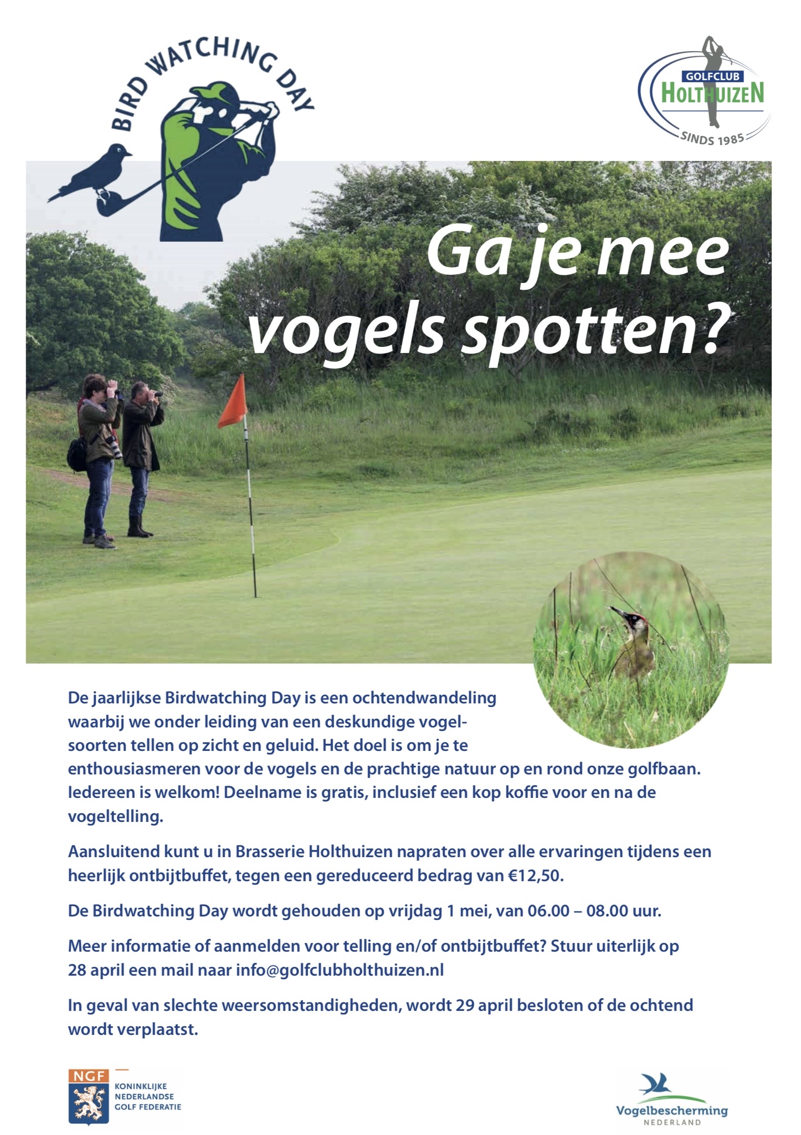Kom ook naar de Birdwatching Day op vrijdag 1 mei van 6-8 uur 's ochtends bij Golfclub Holthuizen aan het Oosteinde 7A in Roden. We beginnen met koffie. Daarna gaan we vogels spotten op het terrein van de golfbaan onder begeleiding van een ervaren IVN vogelgids en vervolgens kun je aanschuiven bij een smakelijk ontbijtbuffet voor €12,50 in de Brasserie.