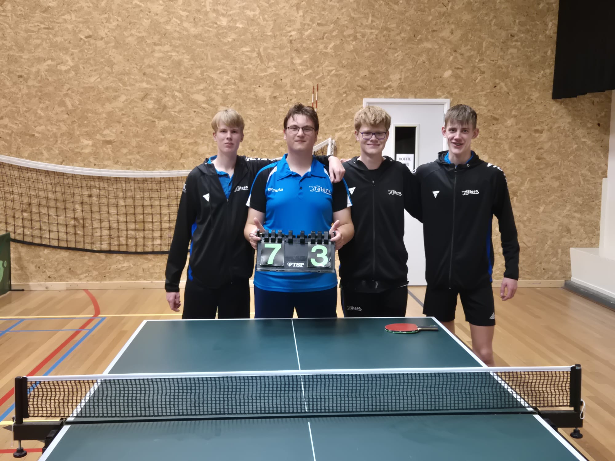 Een wonderlijk tafeltenniskwartet uit Leek, Roden, Emmercompascuum en Hengelo vormde het afgelopen seizoen een hecht vriendenteam dat onverwacht de promotiepoule bereikte. Door zelf met 6-4 te winnen van ttv Ede 2 eindigde ttv Talero 1 vierde in de poule en dat geeft recht op promotiewedstrijden. Bijkomend voordeel is dat ze nu vaker thuiswedstrijden spelen. Na de voorjaarscompetitie valt dit team uit elkaar en dus is dit een mooi toetje voor Mathijs Boer, Dathan Dijksma, Ruben Talen en Mathijs Vening. Alleen Mathijs Boer gaat nog elders door bij de jeugd. De overige spelers stappen definitief over naar de senioren.