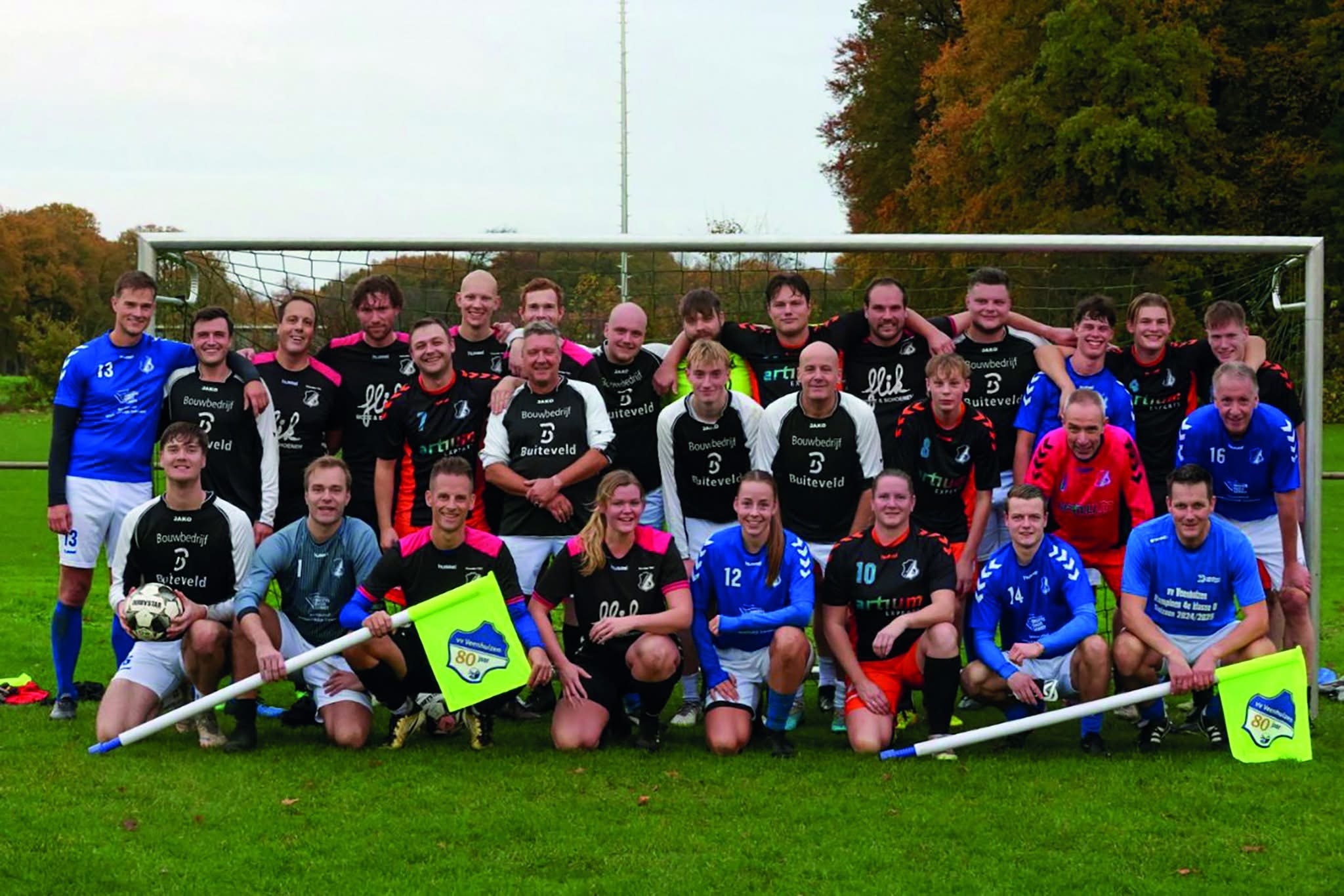 Vijf jaar geleden kon het 75-jarige jubileum in verband met corona niet doorgaan. Vorige week is het jubileum van de inmiddels 80-jarige vereniging wel goed gevierd. Op de oprichtingsdag, dinsdag 28 oktober was er een goed bezochte receptie bij voetbalvereniging Veenhuizen.- En was er een mooi programma. Op die avond zijn er tal van jubilarissen van de club in het zonnetje gezet, bood sponsor Installatiebedrijf Zandvoort nieuwe trainingspakken aan voor het 1e elftal en zijn Herman van Bruggen en Sjouke Rooks aangedragen als erelid van de club, dit zal nog bekrachtigd moeten worden op de algemene ledenvergadering op 17 november a.s..