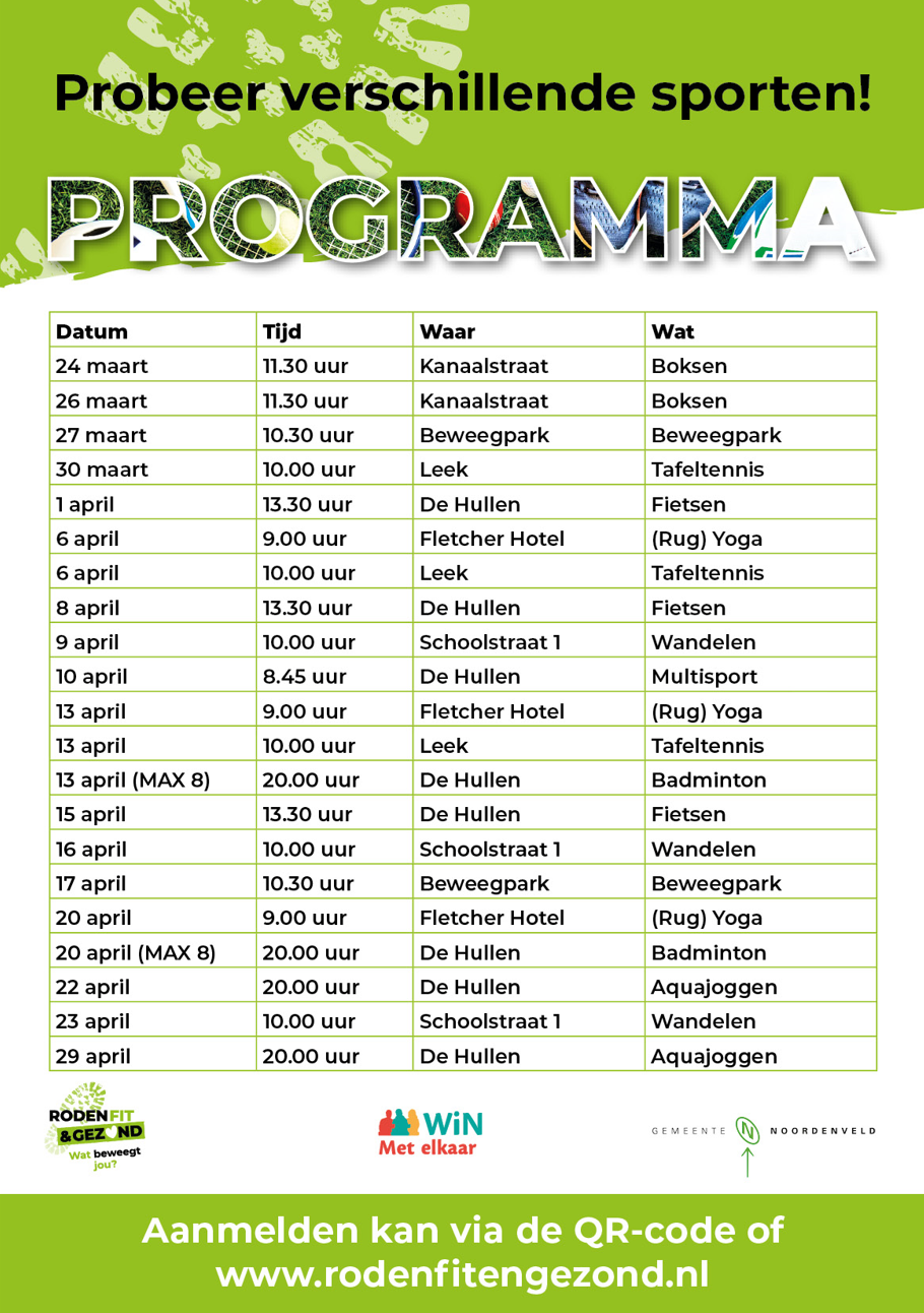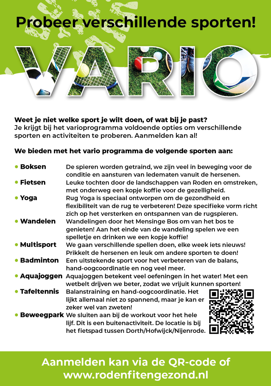 (Weer) in beweging komen, maar weet je niet welke sport je wilt doen, of wat bij je past? Sluit je dan aan bij het Varioprogramma van Roden Fit & Gezond. Gratis en gevarieerd! Je krijgt voldoende opties om verschillende sporten en activiteiten te proberen. Meer info: https://www.rodenfitengezond.nl/activiteiten/varioprogramma-2026/