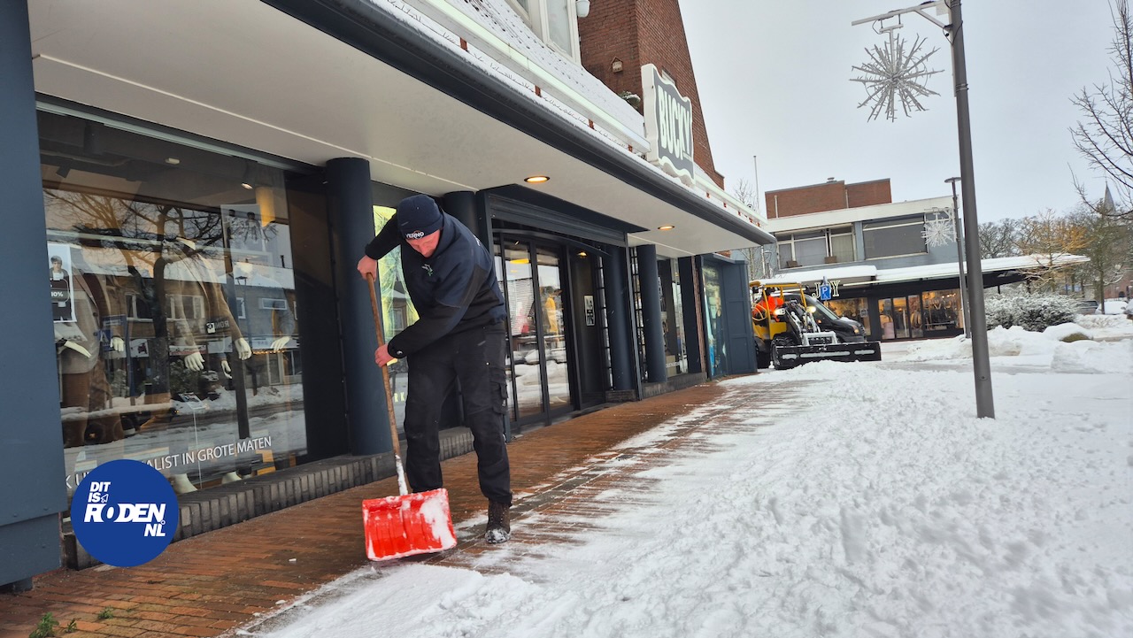 Ondanks de sneeuw die vannacht en in de vroege ochtend is gevallen, heeft de Zakenkring Roden ervoor gezorgd dat het winkelende publiek veilig naar de winkels kan komen. De stoepen zijn schoongeveegd en de straten zijn goed begaanbaar.
