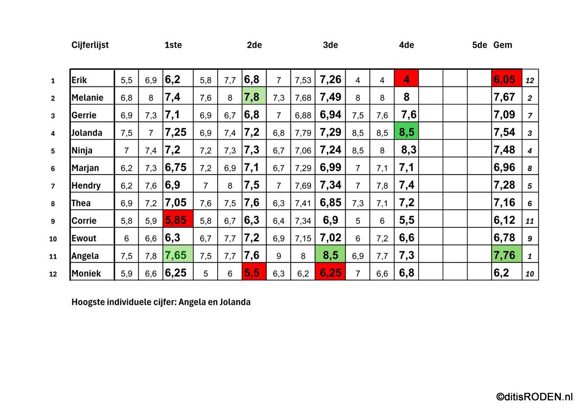 Ook hier liggen de cijfers erg dicht bij elkaar, net als in de eindstrijd, wat te zien is in het overzicht. Op weg naar een spannend slot weten we volgende week wie de winnaars zijn voor dit jaar.