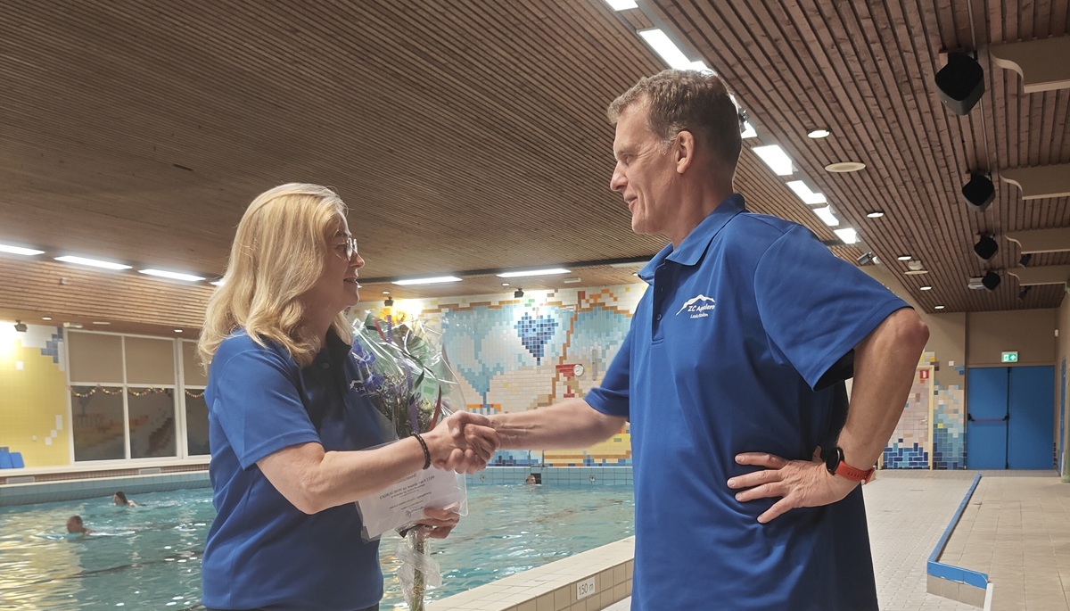 Het jubileumlidmaatschap ging naar masterzwemmer Harald Versteegh. Tijdens de training op donderdagavond werd Harald verrast door Trea Bleker, secretaris van het bestuur. Zij feliciteerde hem met deze bijzondere positie. Als blijk van waardering ontving hij een waardebon van Active Swimwear uit Eelde en een mooie bos bloemen van Studio Blomma uit Leek. Harald: “De vereniging voelt als een warm bad. Ik ben altijd sportief geweest en heb op competitief niveau gefietst bij een wedstrijd wielervereniging. Een blessure maakte helaas hier een einde aan en omdat ik in mijn jeugd heb gezwommen was de overstap naar de zwemsport eigenlijk heel logisch. Het leuke aan zwemmen bij Aqualero is dat er een brede groep zwemmers van jong tot oud ieder op hun eigen niveau kan sporten op zowel recreatief als competitief niveau. Mijn doel is om de technische vaardigheid te verbeteren en plezier te halen uit zowel het sportieve als het sociale aspect binnen de vereniging.”
